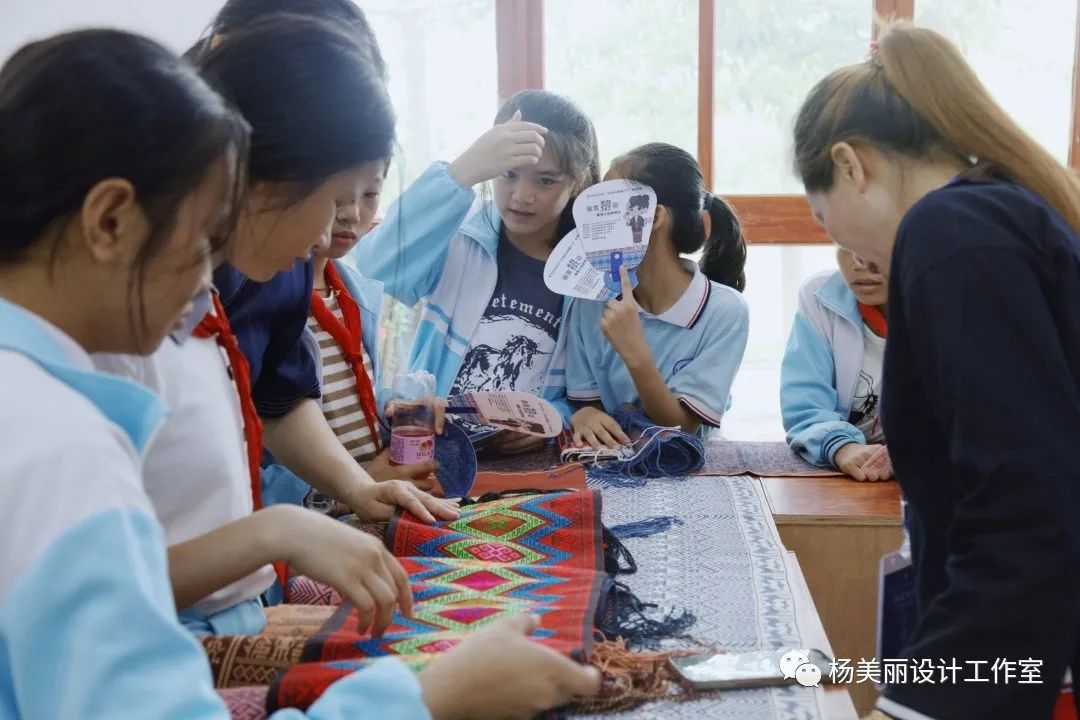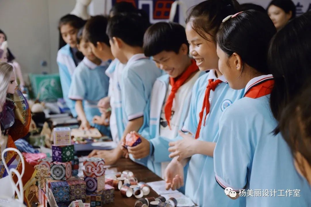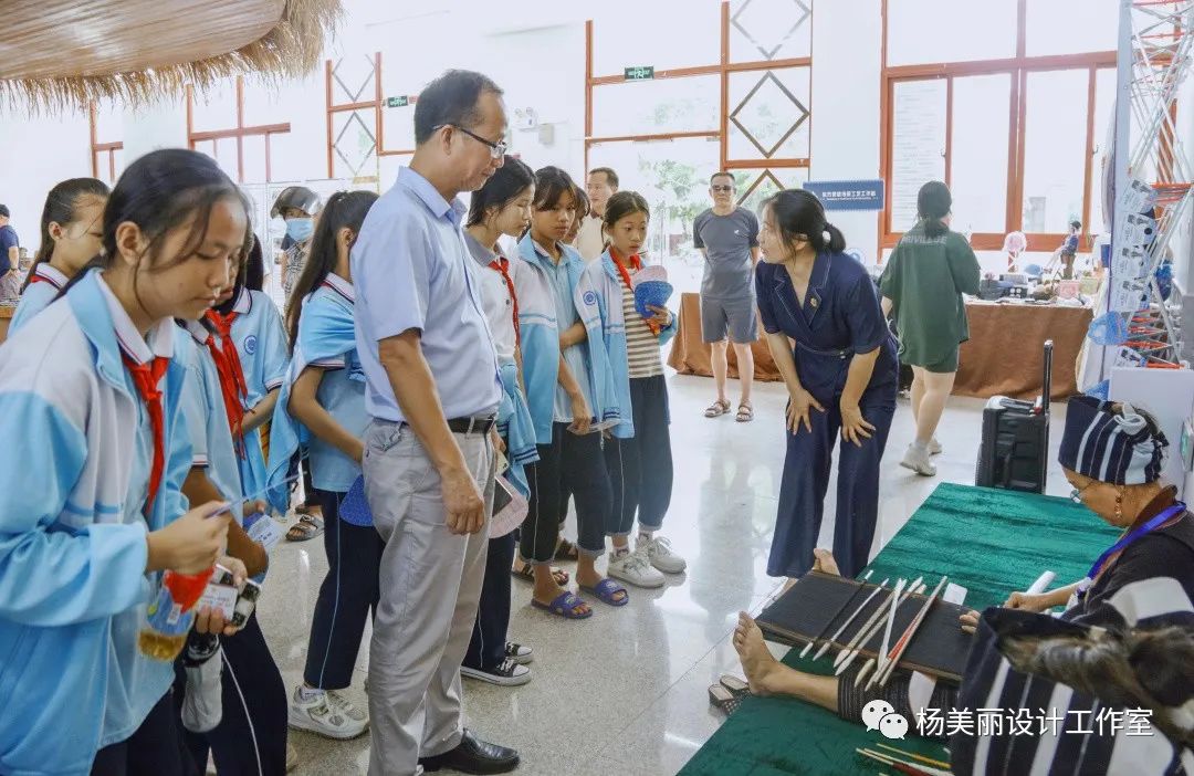 早上9:00,黎锦文创展销会现场迎来了第一批小观众。东河中心公司的30余名师生在符生才董事长的带领下,来到黎大楼展销会现场,进行非物质文化遗产保护知识普及学习。